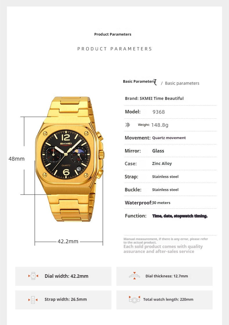 Upgrade your wristwear with this men’s multifunctional quartz watch, designed for both casual and business occasions. With a sleek metal case, water-resistant construction, and a range of classic dial colors, it combines practicality with timeless style.